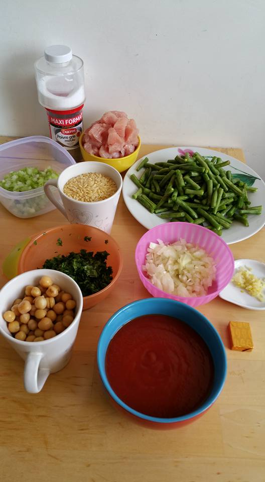 Il nous faut pour 8 bols (grands): 300g de viande au choix coupée en petits morceaux (normalement c'est mieux avec de l'agneau mais moi j'ai juste mis de l'escalope de dinde), 1 Oignon finement haché, 1 petit bouquet de coriandre finement hachée, 1 branche de céleri finement haché, 1 grosse gousse d'ail hachée ou 2 petites, 250ml de purée de tomates, environ 300g d'haricots verts équeutés et coupes en petits tronçons de 3cm, 1 tasse de pois chiche prêts à l'emploi,1 fil d'huile d'olive, 1 tasse de pâtes type "langues d'oiseau " , 1 cube de bouillon de légumes ou de volailles, du sel et du poivre + 2 litres d'eau.