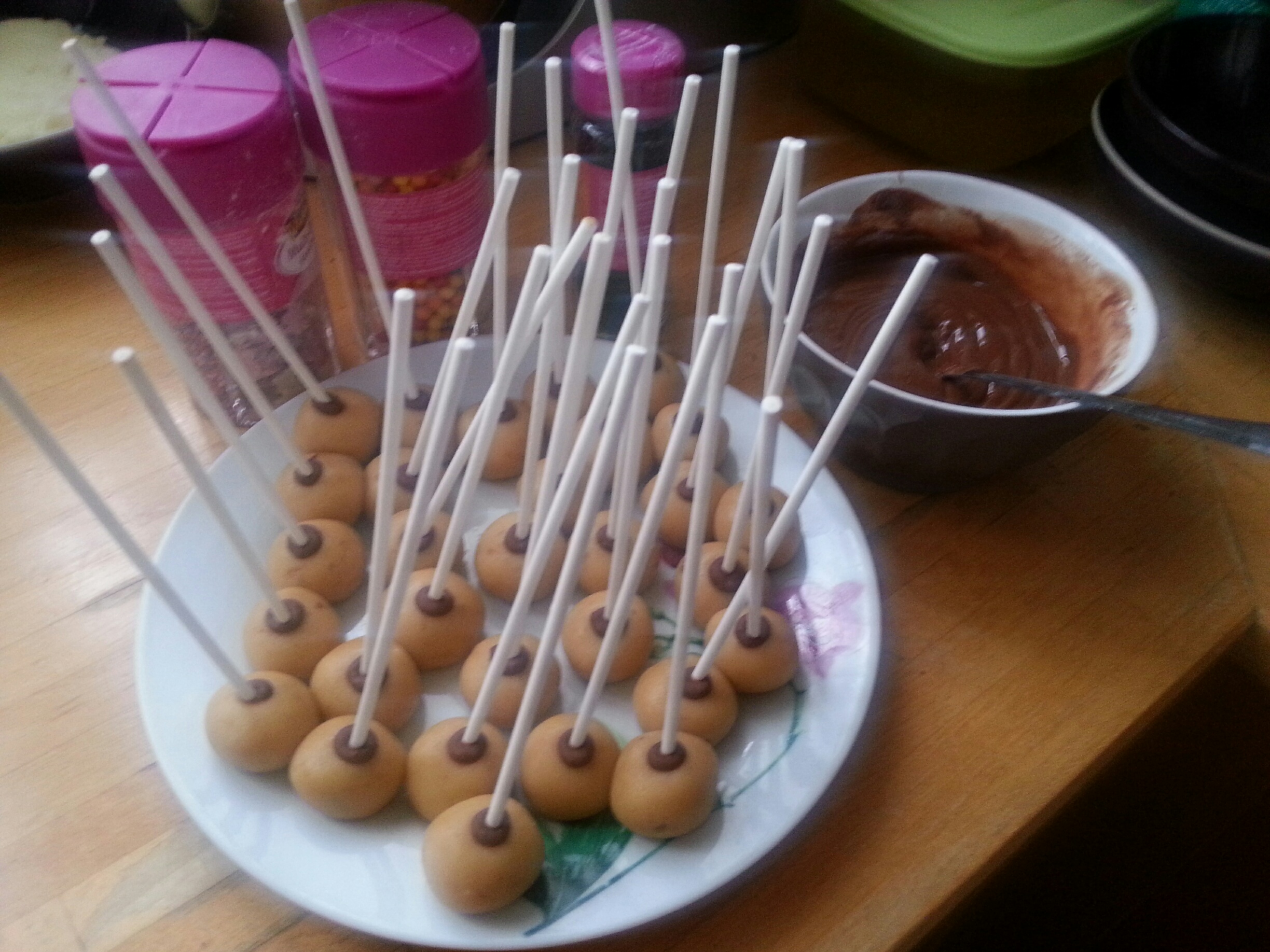 5/Faites fondre un peu de chocolat, puis piquer le bout de chaque bâton à pop cakes dans le chocolat fondu et piquez chaque boule de pâte sans aller trop profond, puis laisser le bâton piqué dans la boule de gâteau. disposez-les tous au réfrigérateur au moins pendant 30 minutes.