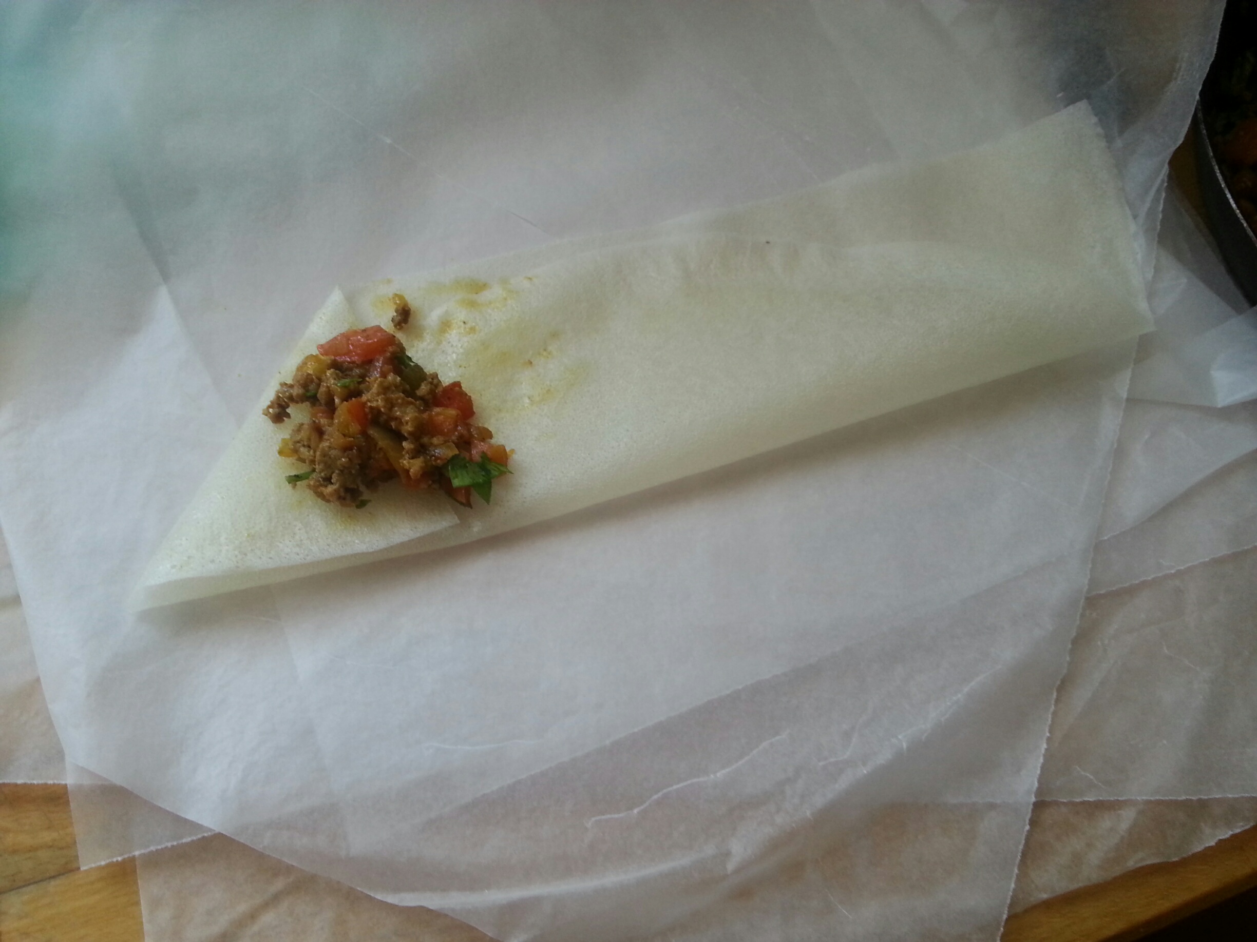 Placez devant vous une demie feuille de brick (j’utilise des feuilles rondes), plier la en 2 la partie arrondie sur la partie coupée.