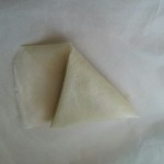 8/ Puis plier vers la droite à nouveau; puis à nouveau une fois à droite, si la samossa n’est pas bien remplie, rajoutez à ce moment là du pliage en tassant bien vers l’intérieur, puis plier à nouveau vers la droite, jusqu’à ce qu’un petit morceaux de feuille brick dépasse, celui-ci vous le rentrer dans le pli de la samossa. (faites bien attention à bien avoir serré la samossa lors du pliage pour pas que la garniture ne s’échappe surtout si vous préférez les cuire à la friture).