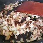 2/Quand les oignons sont translucides j’ajoute une dizaine de champignons coupés en petits morceaux.